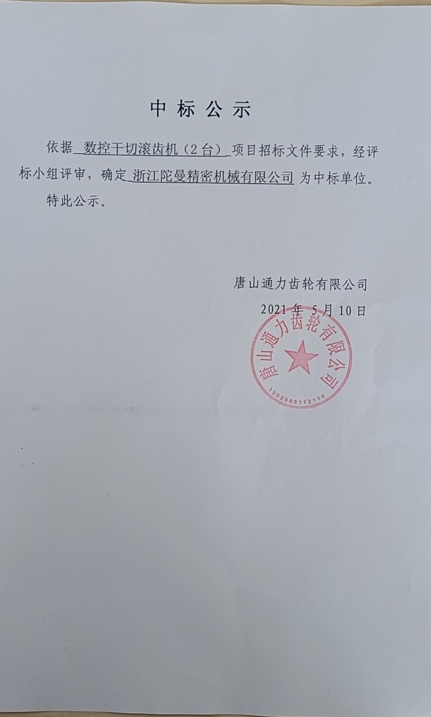【概要描述】唐山通力齿轮有限公司数控干切滚齿机(2台)中标公告