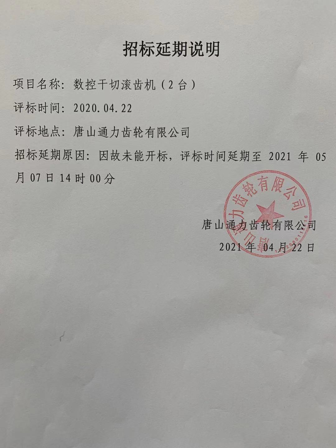 【概要描述】唐山通力齿轮有限公司设备招标延期说明